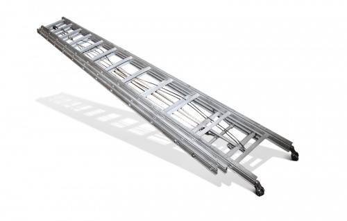 Лестница состоит из трех телескопически сдвигающихся колен, сделанных из однотипных профилей и деталей. Принцип выдвигания колен - ручной с помощью канатов и блоков. У лестницы имеется подвижной блок, установленный на втором колене. Первое колено подвешено на стальном канате диаметром 4,8 мм, второе - выдвигается с помощью пенькового каната диаметром 10, мм. Канат, верхний конец которого закреплен на верхней ступени третьего колена, проходит к нижней ступени третьего колена где и закрепляется второе колено.
