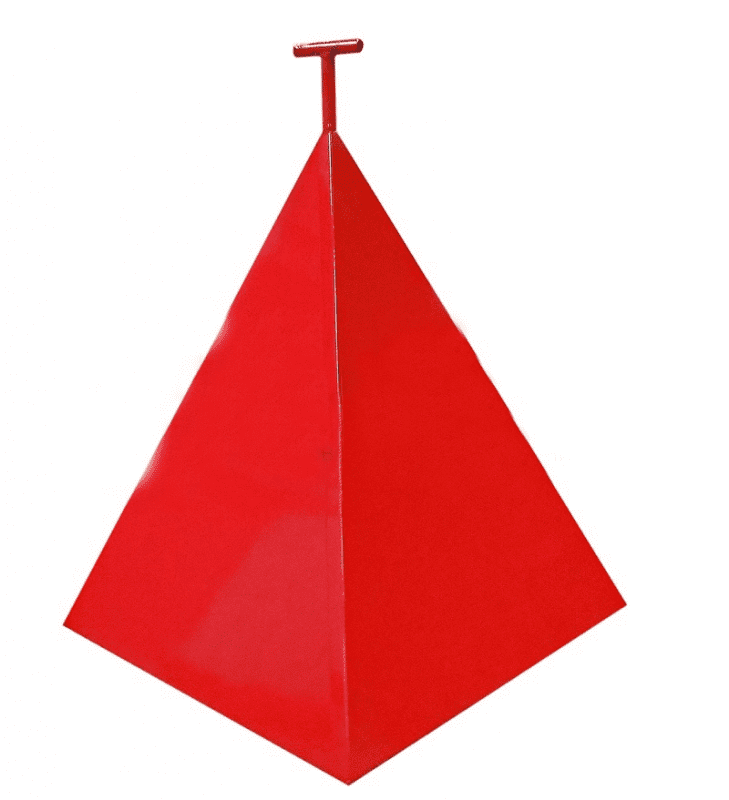 Пожарная пирамида для гидрантов (размер 750x750x900 мм) служит для ограждения, защиты и обнаружения пожарных гидрантов во время проведения ремонтных и технических работ. Конструкция выполнена в виде трехгранного конуса, оборудованного Т-образной ручкой для удобного перемещения.