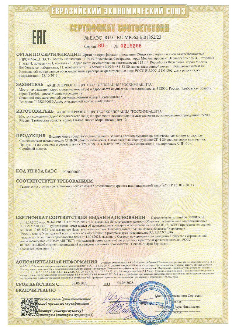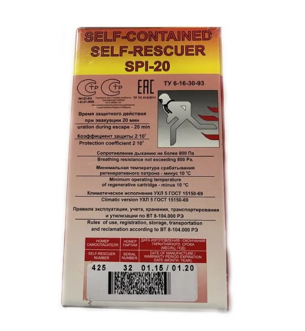 Самоспасатель изолирующий СПИ-20 производится государственной корпорацией АО «Корпорация «Росхимзащита» и соответствует требованиям технического регламента Таможенного союза ТР ТС 019/2011 «О безопасности средств индивидуальной защиты» и ФЗ от 22 июля 2008 г. № 123-ФЗ «Технический регламент о требованиях пожарной безопасности».